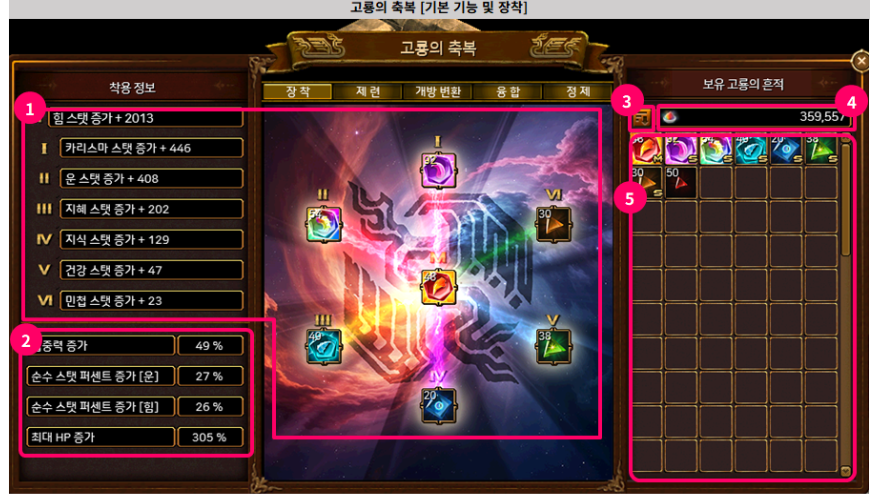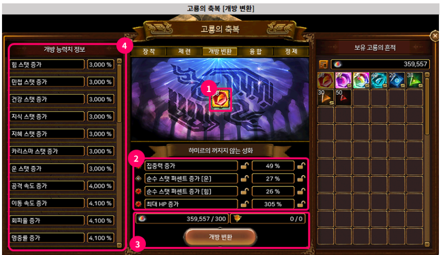 ③ 固定機能: 登録された痕跡の開放能力値を固定でき、固定ボタンを使って最大2個までの能力値を固定できます。
