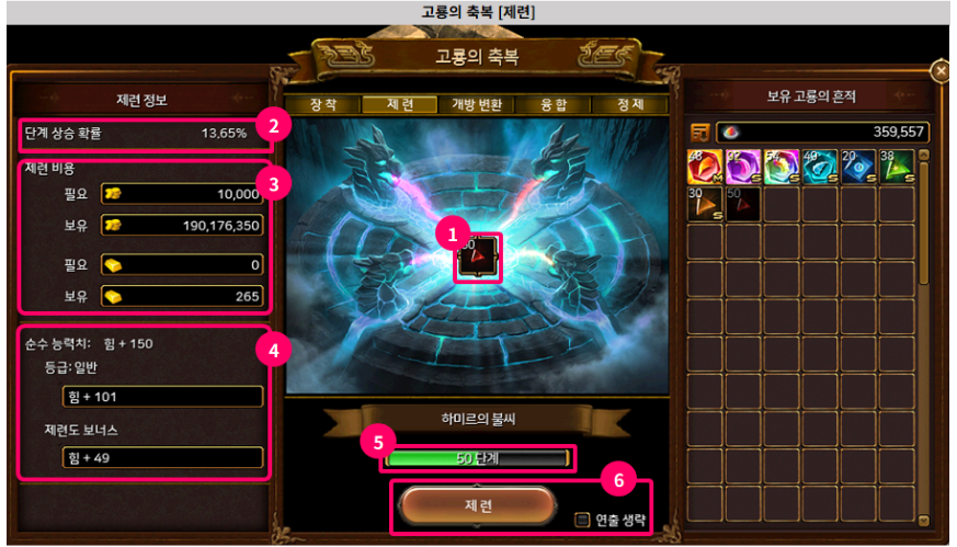 精錬に失敗しても段階は下がらず維持され、精錬度は1〜100の精錬段階のうち無作為に一定確率で上昇します。