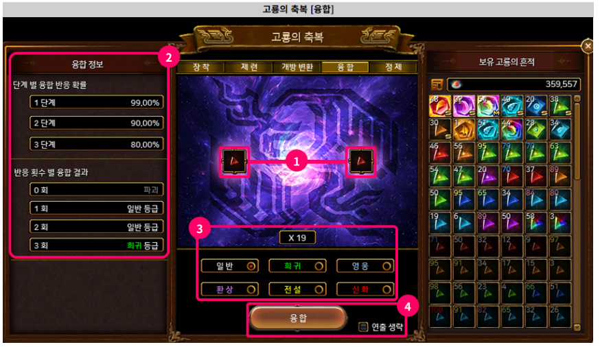 ② 融合情報: 融合を試みると3つの反応が表示され、「段階別 融合反応確率」で各段階の成功確率を確認できます。