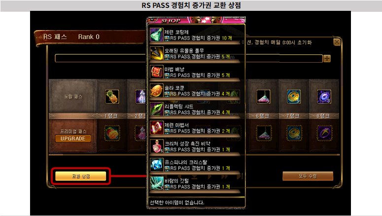 500ウォン | RS PASSの経験値が10増加します。 RS PASS交換ショップで使用可能です。 |